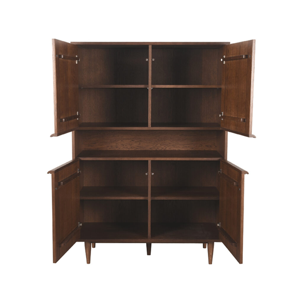 De fijne groeven op de deurtjes van de kast accentueren op een subtiele wijze het speelse karakter. De Hoge Kast is verdeeld in drie delen. Het bovenste en onderste gedeelte zijn voorzien van een plank aan de binnenzijde en worden ieder afgesloten door twee deurtjes. In het midden van de kast is een open gedeelte waardoor de kast speels wordt. De hoge poten zorgen voor een luchtig geheel.