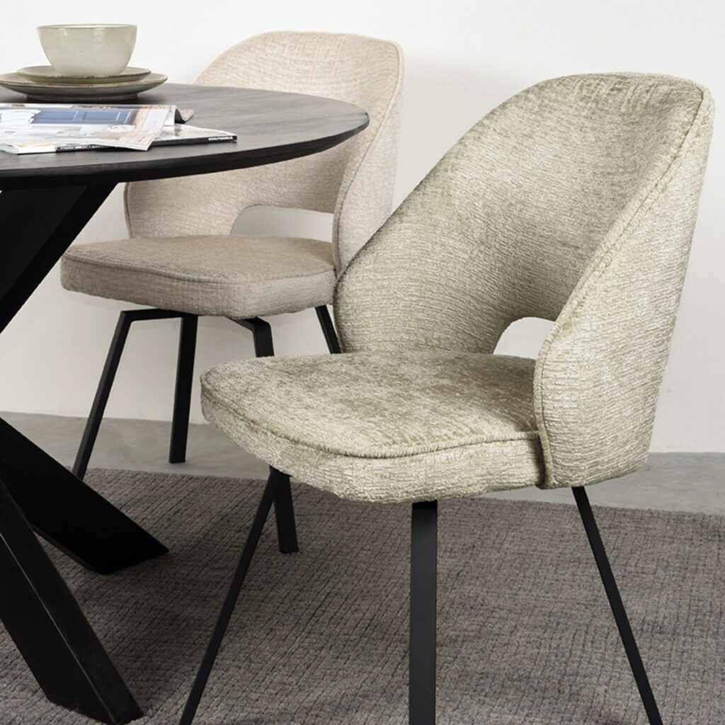 Eetkamerstoel Lewis heeft een opening in de rug, wat bijdraagt aan het zachte uiterlijk van de stoel. De hoogwaardige stof desert elegance, waarmee deze stoel bekleed is, geeft de stoel een moderne uitstraling. Het model is gemakkelijk te combineren en is hierdoor goed te plaatsen in ieder interieur. Lewis is voorzien van een zwart metalen frame met een slim draaisysteem, waardoor het gebruiksgemak van deze stoel ontzettend groot is.
