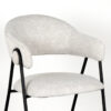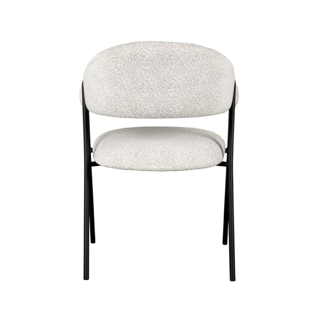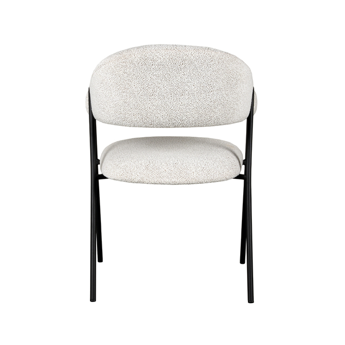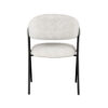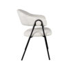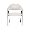 Eetkamerstoel Lowen, uitgevoerd in champagne bouclé bestaat uit een aparte zitting en ronde rugleuning die vanuit de rug doorloopt in armleuningen. Aan beide zijden van de rugleuning bevindt zich een speelse ‘knoop’. Het frame, uitgevoerd in zwart metaal, die de verbinding vormt tussen zitting en rugleuning, is om deze ‘knoop’ heen gedraaid. Deze gave toevoeging zorgt ervoor dat Lowen een uniek uiterlijk heeft, met aan alle kanten een fantastisch uiterlijk. Naast het gave uiterlijk heeft Lowen een super stabiele en comfortabele zit.