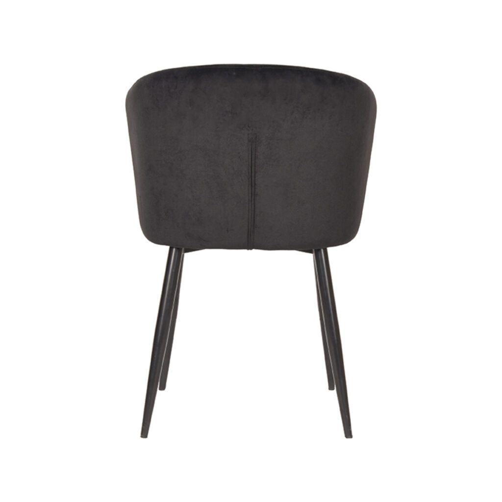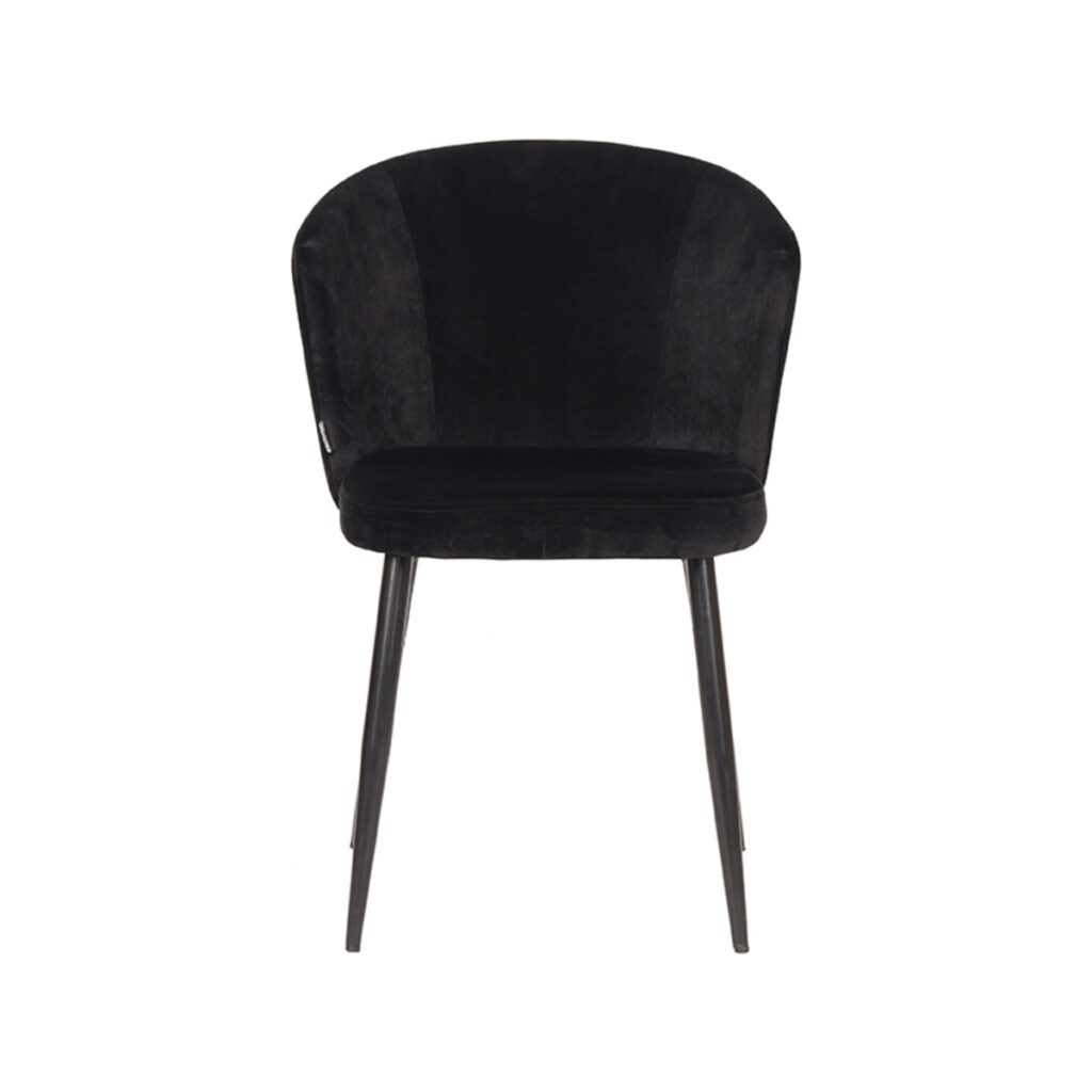 Wave, uitgevoerd in zwart fluweel heeft een vierkant gevormde zitting met elegante rondingen waardoor er een prettig zitoppervlak ontstaat. De strakke maar zeer elegante rugleuning heeft een ergonomisch design en een trendy uitstraling door de gave golvende vorm. De zwarte naar buiten staande poten zorgen ervoor dat de stoel lekker stabiel op de grond staat.