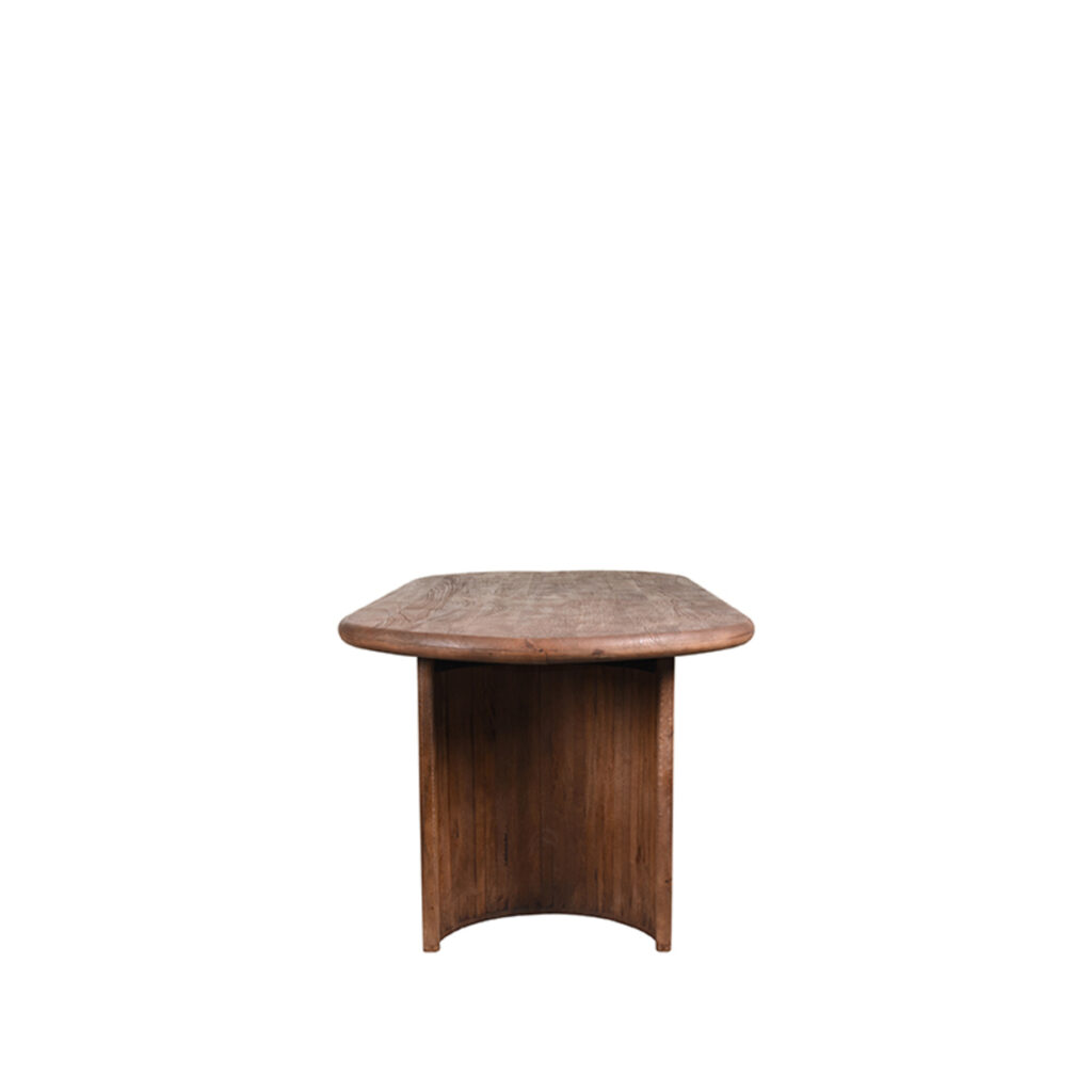 Eettafel Vito bestaat uit een recht tafelblad van 240×100 cm, met ronde korte zijdes en een opgedikte ronde rand, wat zorgt voor een extra chique uitstraling. Vito zorgt dat je gezellig kunt zitten omdat je rond de gehele tafel aanschuift om de ruimte optimaal te benutten. Vito is uitgevoerd in de kleur espresso, en vervaardigd van gezandstraald mangohout. Het hout heeft een prachtige subtiele structuur waardoor de salontafel nog meer karakter krijgt. Onder het blad bevinden zich twee houten poten, bestaand uit halve cirkels. Ook deze poten zijn uitgevoerd in espresso mangohout en zorgen naast het speelse en charmante beeld ook nog eens voor extra stabiliteit.