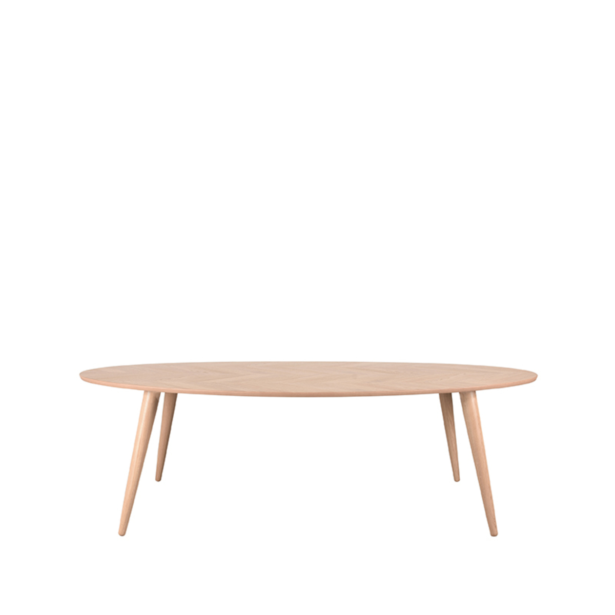 Eettafel Ines heeft een ovaal tafelblad dat rust op vier kegelvormige hoge poten. Doordat de poten licht naar binnen staan krijgt de tafel een speels accent. Het vissengraatpatroon op het tafelblad geeft de tafel een elegante uitstraling. Deze tafel past perfect in een modern en minimalistisch interieur.