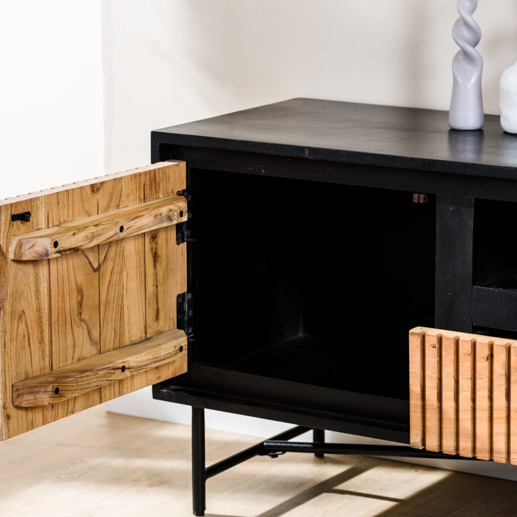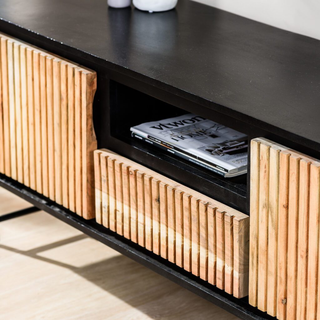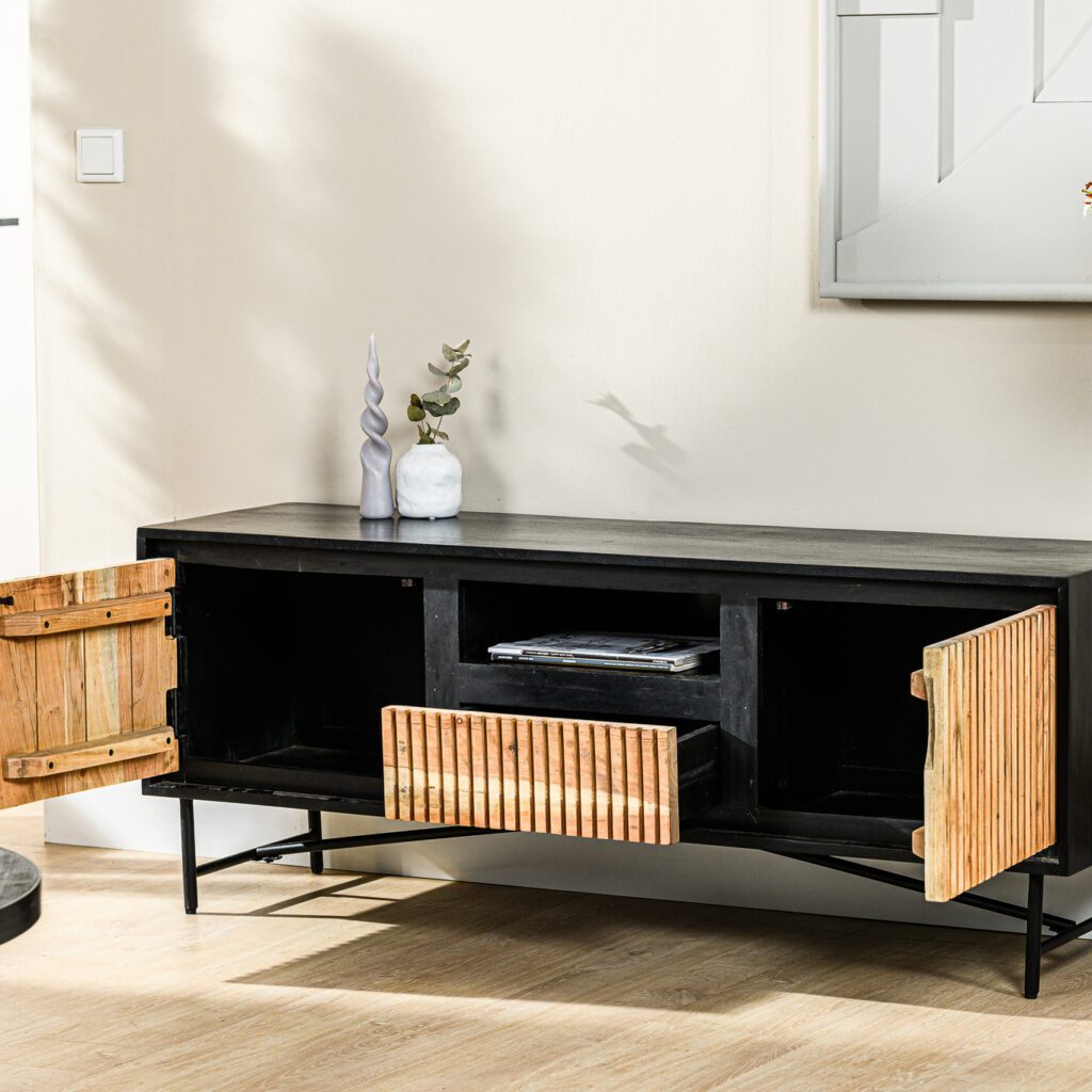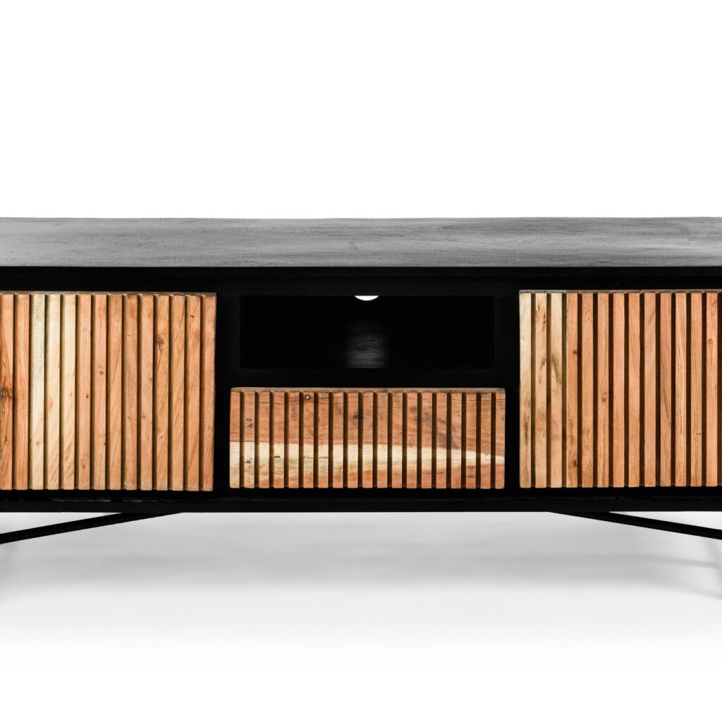 Stap binnen in de wereld van tijdloze elegantie met het tv-meubel Liv, een meesterwerk van vakmanschap en stijl. Dit prachtige meubelstuk is vervaardigd van hoogwaardig acaciahout, waarvan de warme, natuurlijke tinten moeiteloos samenkomen met een verfijnde zwarte afwerking, waardoor een perfecte balans ontstaat tussen moderniteit en klassieke charme.